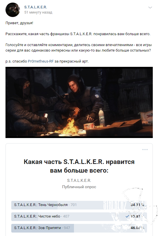В официальной группе Вконтакте посвященной S.T.A.L.K.E.R. 2 появился опрос, какая часть понравилась игрокам больше всего?